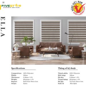 Rèm cầu vồng hãng FIVESTAR được làm từ vải tổng hợp polyester với hai dạng dệt hoàn toàn khác nhau. Trong đó, một lớp vải dày và khít có tác dụng che chắn ánh sáng. Một lớp vải mỏng như lưới giúp tạo ra không gian mở để bạn có thể nhìn xuyên ra bên ngoài. Chất liệu polyester cao cấp có độ bền rất cao, khả năng chống nắng tốt, thân thiện với môi trường và an toàn cho người sử dụng.