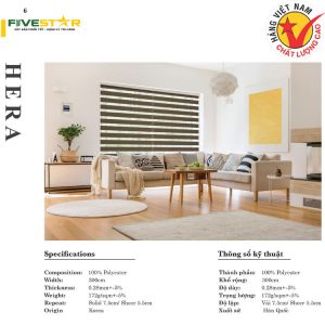 Rèm cầu vồng hãng FIVESTAR được làm từ vải tổng hợp polyester với hai dạng dệt hoàn toàn khác nhau. Trong đó, một lớp vải dày và khít có tác dụng che chắn ánh sáng. Một lớp vải mỏng như lưới giúp tạo ra không gian mở để bạn có thể nhìn xuyên ra bên ngoài. Chất liệu polyester cao cấp có độ bền rất cao, khả năng chống nắng tốt, thân thiện với môi trường và an toàn cho người sử dụng.