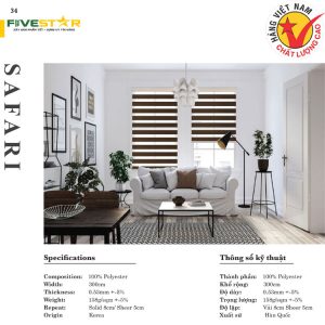 Rèm cầu vồng hãng FIVESTAR được làm từ vải tổng hợp polyester với hai dạng dệt hoàn toàn khác nhau. Trong đó, một lớp vải dày và khít có tác dụng che chắn ánh sáng. Một lớp vải mỏng như lưới giúp tạo ra không gian mở để bạn có thể nhìn xuyên ra bên ngoài. Chất liệu polyester cao cấp có độ bền rất cao, khả năng chống nắng tốt, thân thiện với môi trường và an toàn cho người sử dụng.